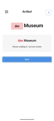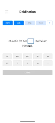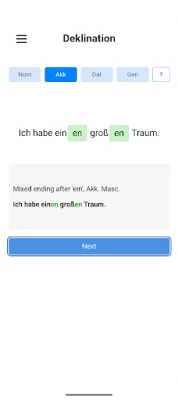 Experimentați o abordare practică prin funcționalități atent concepute. Exersați utilizarea articolelor „der/die/das" în contexte variate, înțelegând subtilitățile fiecărei situații. Aprofundați terminațiile adjectivelor, parcurgând toate cazurile gramaticale esențiale. Fiecare răspuns primește feedback instantaneu, transformând greșelile în oportunități de învățare și accelerând progresul. Designul aplicației este minimalist și intuitiv, eliminând orice distragere, astfel încât să vă puteți concentra pe ceea ce contează cu adevărat: asimilarea cunoștințelor.