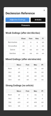 Ai dificultăți cu declinările germane? Deklination te ajută să exersezi terminațiile articolelor și adjectivelor în toate cele patru cazuri: Nominativ, Acuzativ, Dativ și Genitiv. Perfecționează-ți gramatica germană eficient.